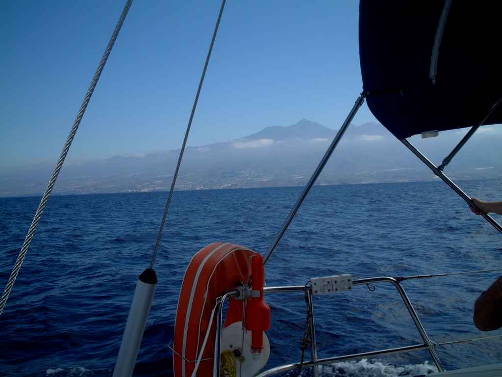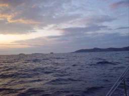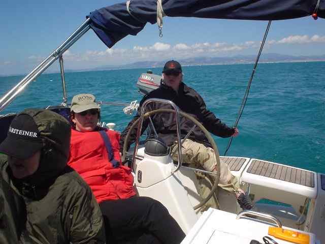 Die erste Nacht und das Ablegen danach waren neue Eindrücke die erst einmal der Körper verkraften musste. Mit leichter Briese und Motor ging es hinaus in die Bucht von Palma um vor dem Ballermann erstenmal zu stoppen und die neu gekauften Angeln zu testen. Angeln=Köder baden – oder der klägliche Versuch den Speisezettel ein wenig zu beleben. Hinzu kam, das wir leicht vor der Dünung trieben und dies noch so schnell, da hätten wir schon einen schlafenden Fisch zufällig mit dem Hacken Aufpickseen müssen den jeder Versuch eines Fisches, diesen zu bekommen musste bei allem guten Wünschen in die Schuppen gehen. Selbst ein abgerichteter Fisch hätte große Schwierigkeiten gehabt uns zu folgen. Kurzum die Speisekate blieb weiß und unsere Yacht wurde nicht zu einer Fischräucherkammer umgerüstet. Segel hoch und bei leicht einsetzendem Wind raus ins Blaue. |