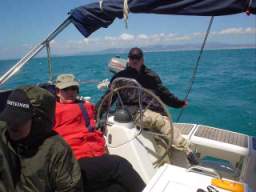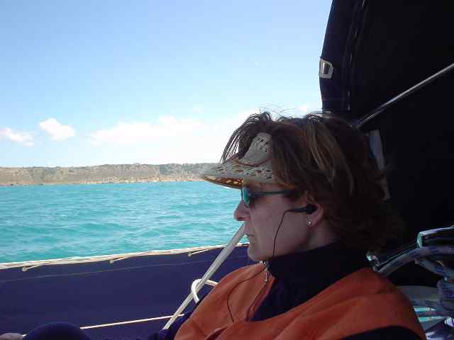 Die Mannschaft hatte viel Spaß an dieser Fahrt durch die rauschenden Wellen. Es war mir schon eine ganze Zeit lang aufgefallen, das die Höhe zunahm und wir trotz Reff immer noch mit 8-9 kn durch die kribblige See gingen. Die drei Meter Welle kam schon regelmäßig mal vorbei, blieb aber zum Glück nicht. An der Südostspitze angekommen gingen wir auf Westkurs um den Leuchtturm von Pta Imperial zu runden. Nach der Rundung ging es nach Norden in Richtung Cabo Liebeig wo die Einfahrt zur Bucht lag. Wind mit einer konst. Geschwindigkeit von 25-30kn lies ein trockenes Segeln nicht mehr zu. Mit Reff und Kränkung ging es hinaus aus Meer um die Höhe zu bekommen. | |