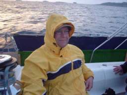 Nach dem festmachen gegen 1430 Uhr wurde das Beiboot klar gemacht und die Mannschaft ausgeschifft zum Badestrand. In der Brandung raus ins Wasser. Bei unserem Törn war uns schon etwas im Wasser aufgefallen. Kleine Himbeerkondome schwammen auf der Wasseroberfläche. Jetzt konnten wir sie genauer untersuchen. Eine Art Qualle die ein Segel führt und sich so treiben lässt. Das Bild aus der Kondom-Werbung „heute Abend das kleine Schwarze „ kennt jeder und so sahen die Dinger auch aus nur in Lila. Ein herrlicher Nachmittag am Strand ging zu Ende. Nur Dorit hatte großes Pech, eine 10cm lange Risswunde an der Wade verdammte Sie dazu keinen Kontakt mit dem Salzwasser aufzunehmen. |